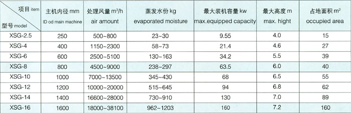 注:1.水份蒸发量以进风温度200℃出风80℃计 2.装机容量为基本数据,可根据物料的理化性能改变 3.占地面积根据实际情况布置. 表中数据仅供参考